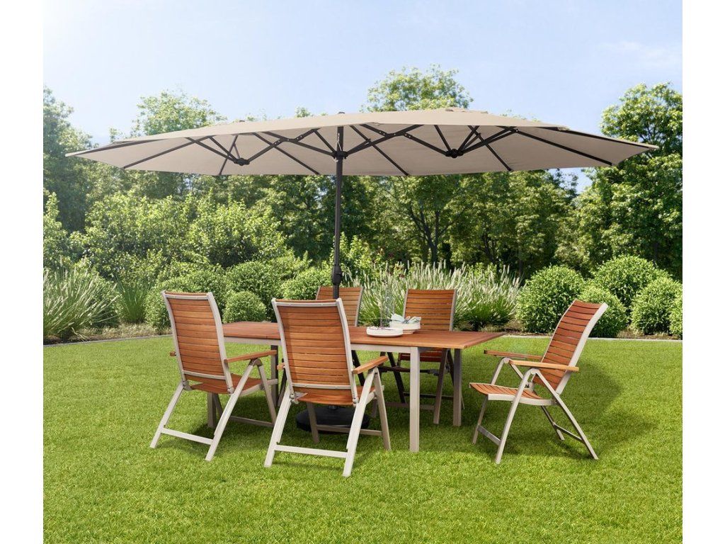 Opravdu velký, středový slunečník se dvěma rameny pro komfortní stínění oválného stolu.