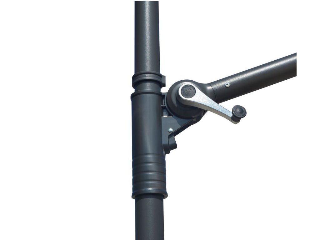 Součástí slunečníku je křížový podstavec, který je zapotřebí zatížit dlaždicemi. Slunečník se otevírá pomocí kličky. Lze u něho nastavit úhel stínění jednoduchým posunutím po stojné tyči. Zároveň je zde i možnost otáčení o 360° za pomoci pedálu.
