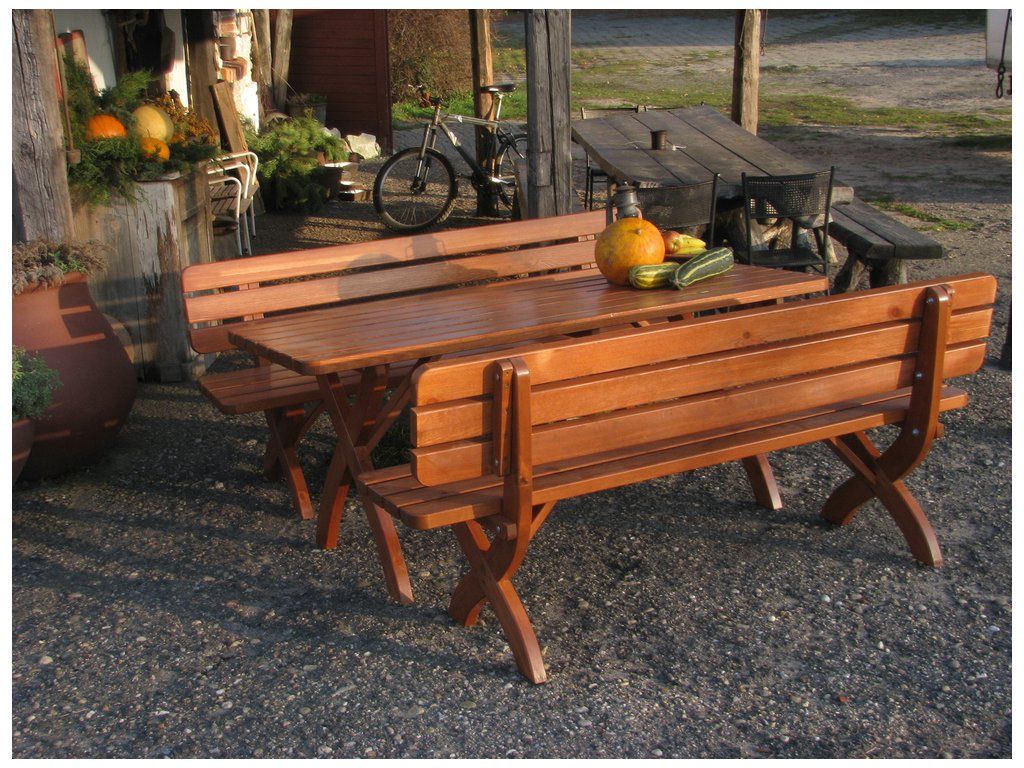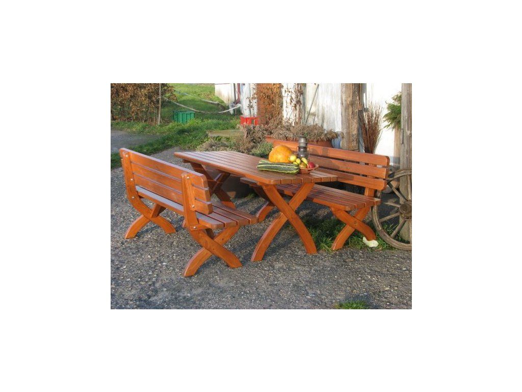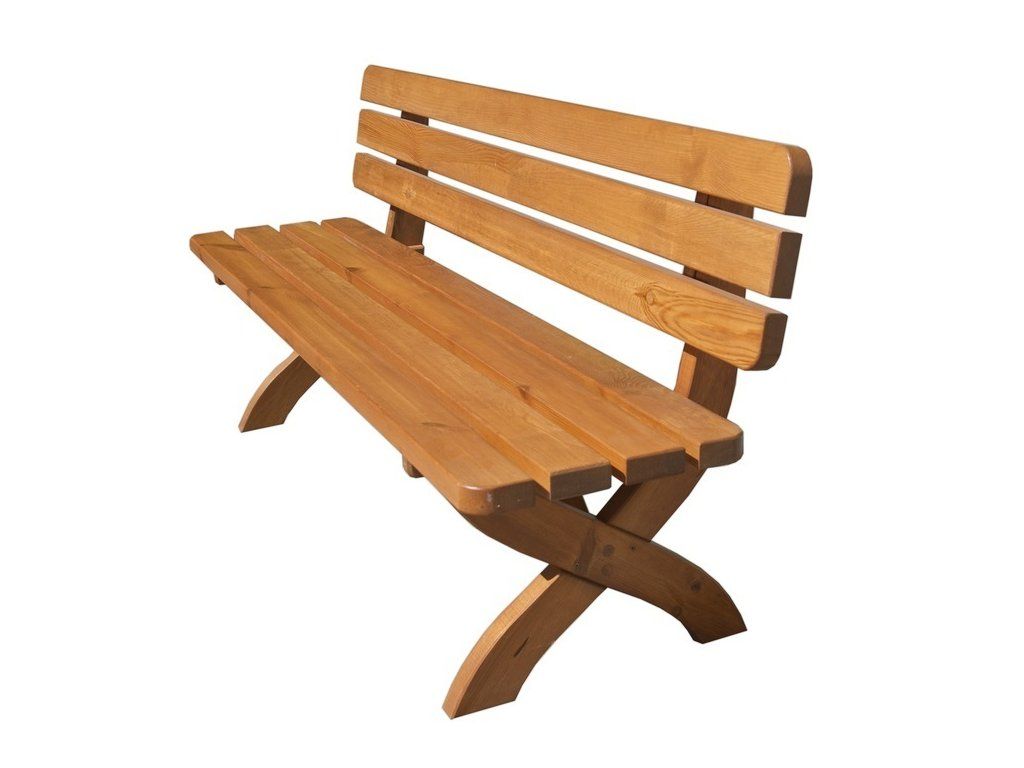 Masivní zahradní lavice z borovicového dřeva, které je lakované.