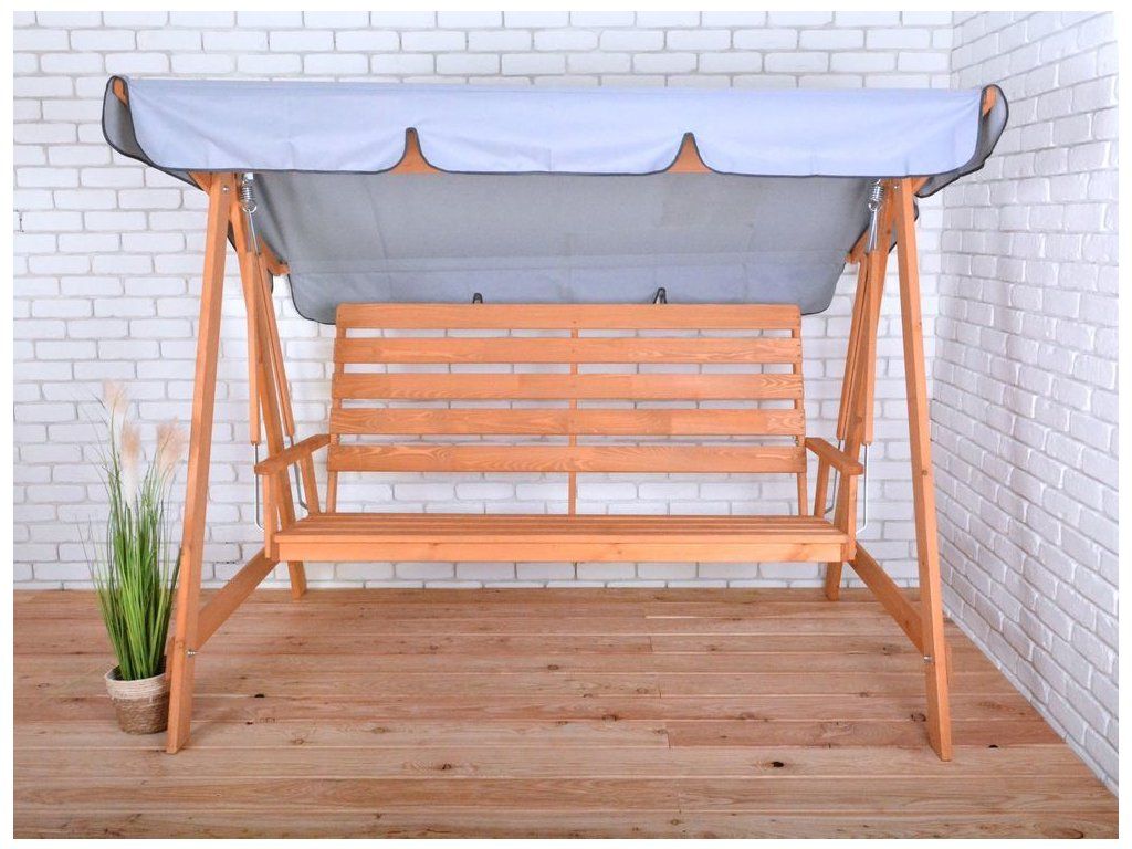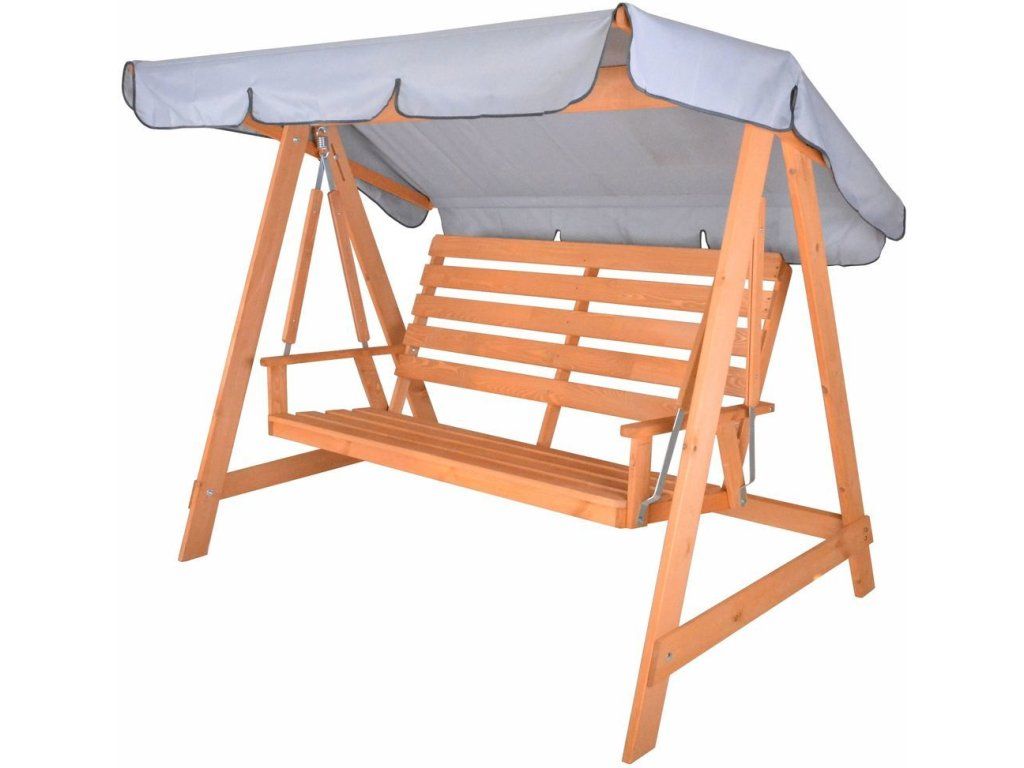 Dřevěná zahradní houpačka z borovicového dřeva a s šedou stříškou. Konstrukce je mořená do medové barvy.