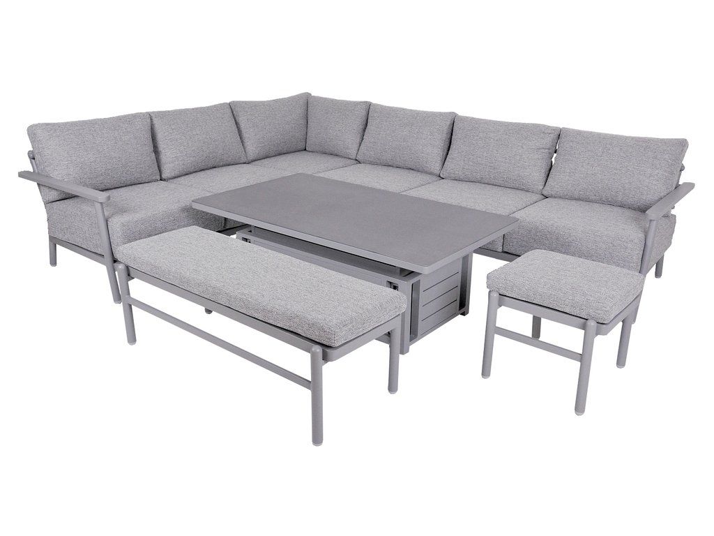 | materiál: | hliníková konstrukce + 20 cm vysoké podušky (polyester), deska stolu - keramické sklo |