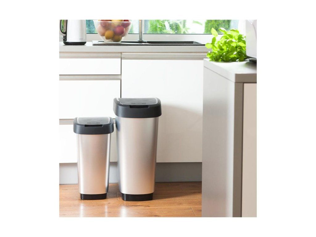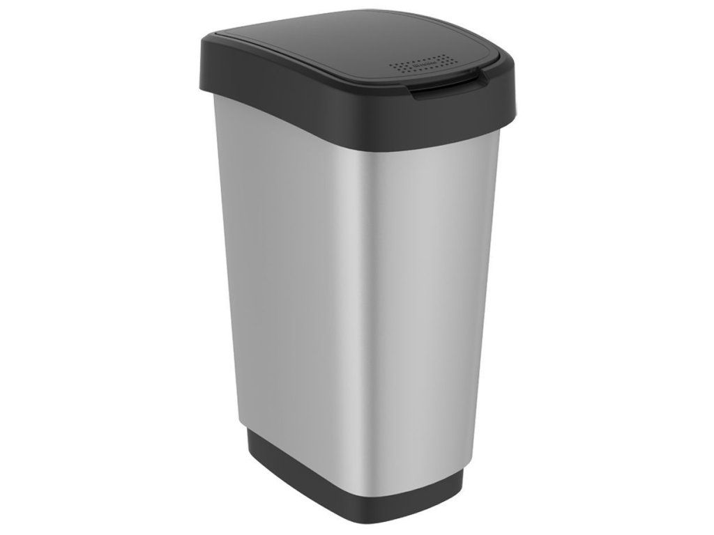 Metalický plastový odpadkový koš s odklápěcím víkem.