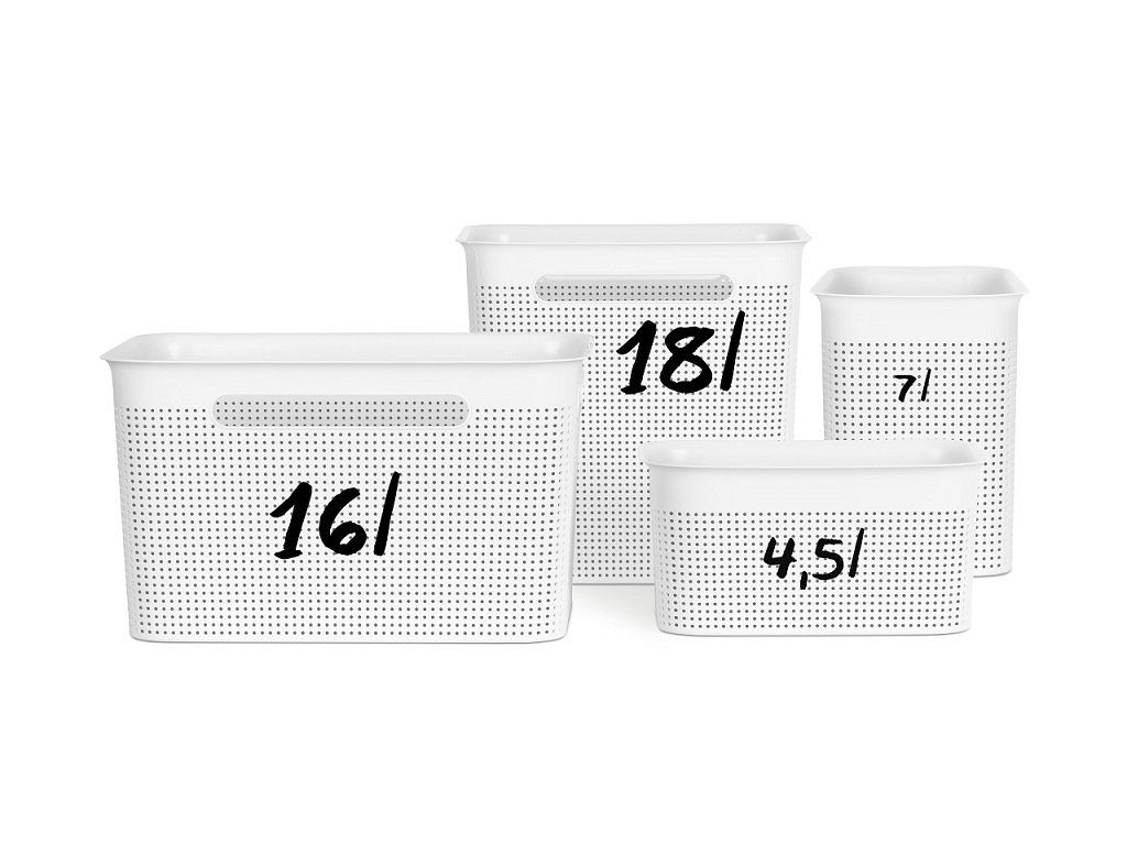 Úložný box s děrovanou strukturou.