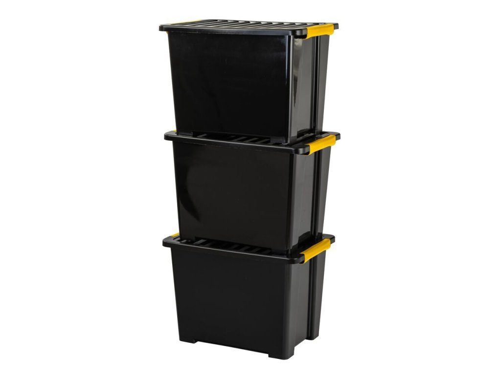 Víko je opatřeno žlutými postranními úchyty pro bezpečné zaklapnutí.