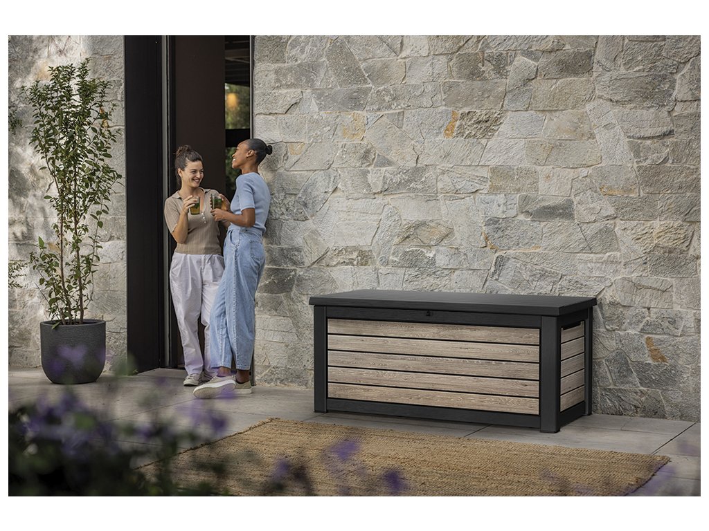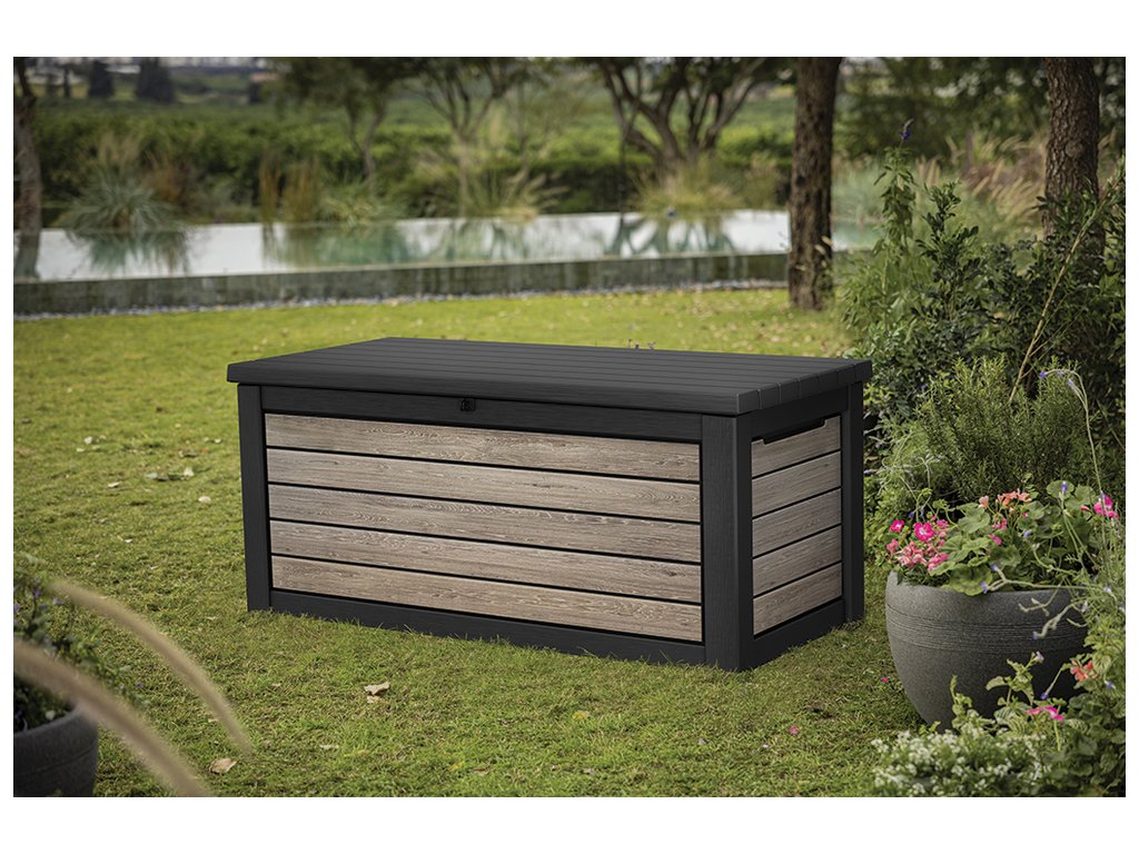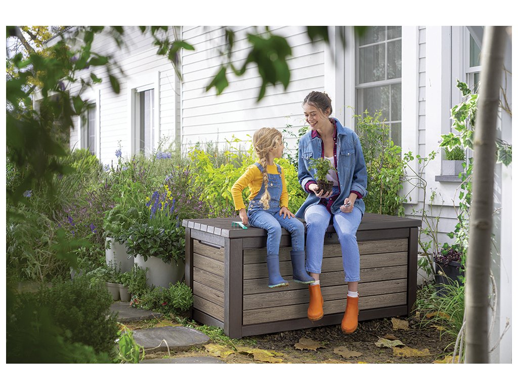 - Jednotný design: Úložný box v elegantním odstínu vlašského ořechu (walnut) je součástí řady SIGNATURE, což Vám umožní sjednotit exteriér s dalšími prvky, jako je zahradní domek nebo vysoká úložná skříň či skříň na popelnice.