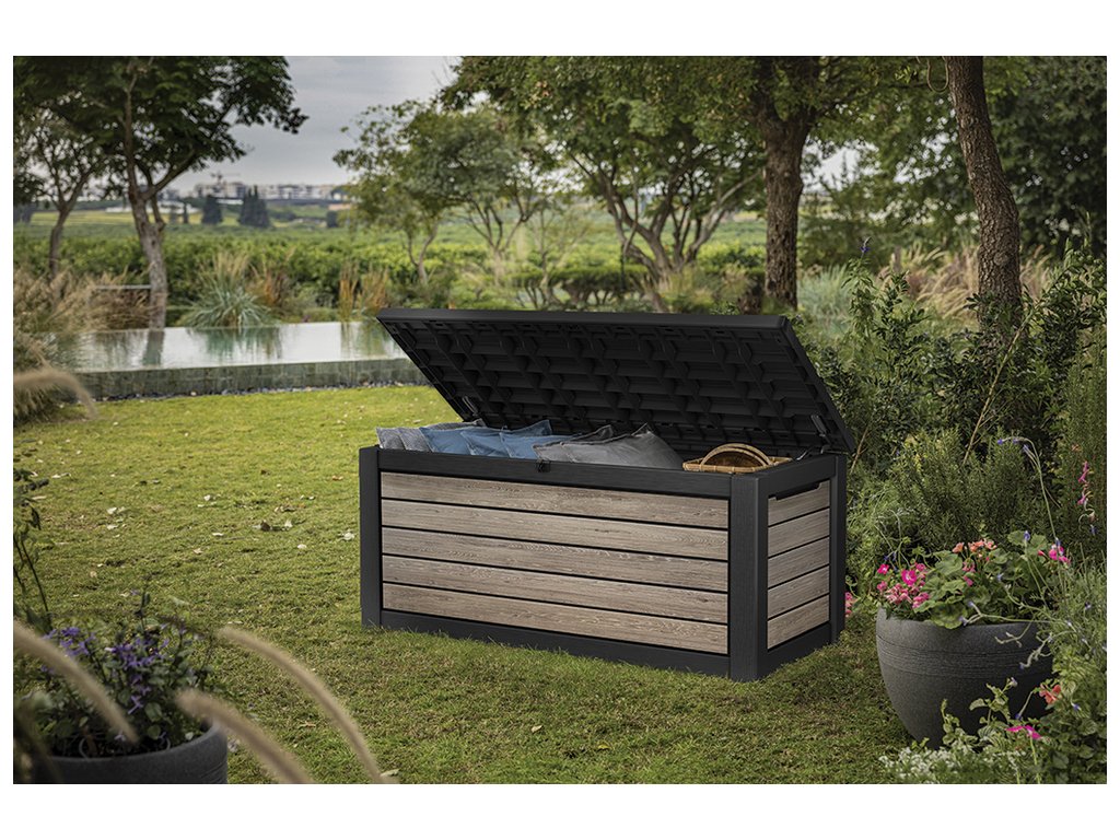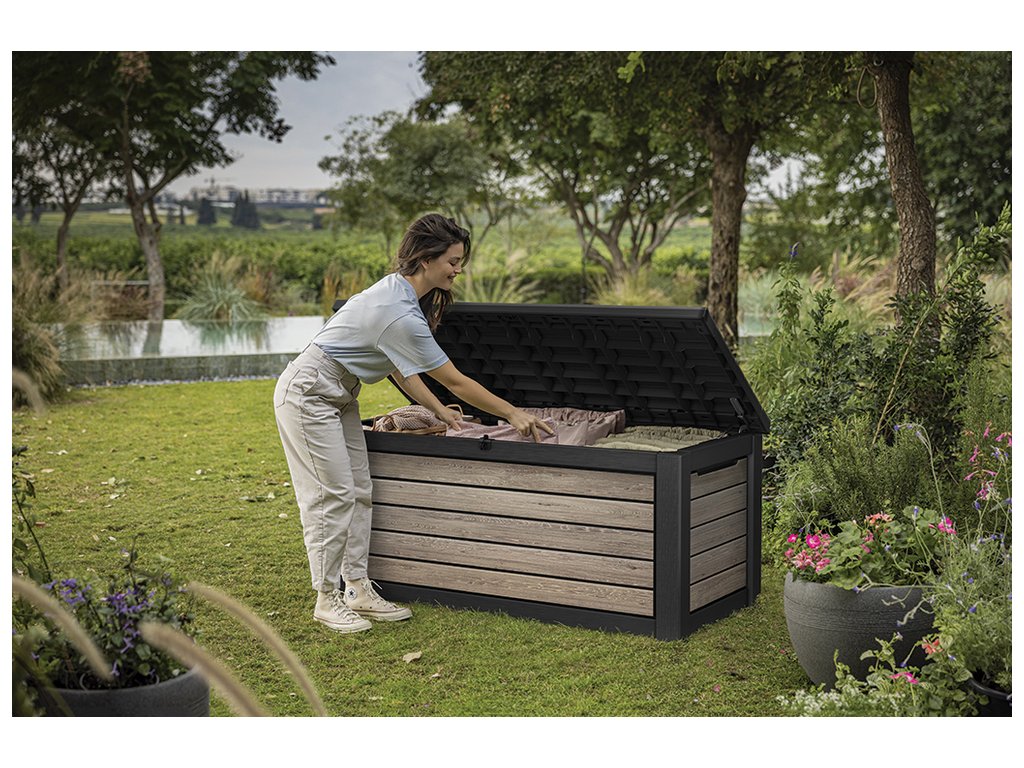 - Prostornost a organizace: Objem 630 L poskytuje dostatek místa pro uložení různých zahradních potřeb, jako jsou podušky, květináče a další doplňky. Jednoduchému otevírání pomáhají hydraulické písty, díky nimž víko zároveň drží v otevřené poloze.