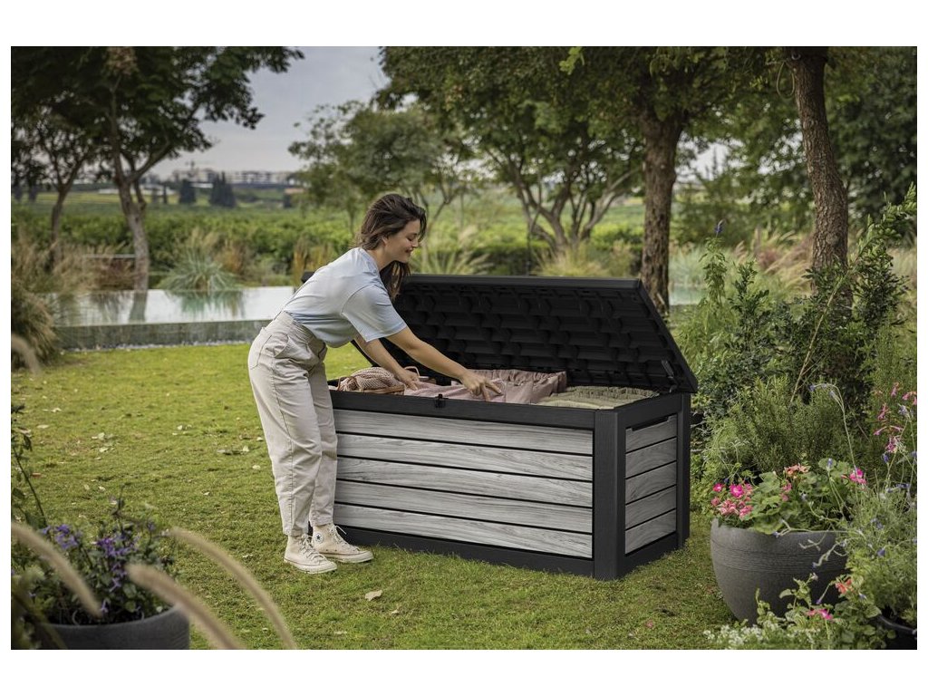- Prostornost a organizace: Objem 630 L poskytuje dostatek místa pro uložení různých zahradních potřeb, jako jsou podušky, květináče a další doplňky. Jednoduchému otevírání pomáhají hydraulické písty, díky nimž víko zároveň drží v otevřené poloze.