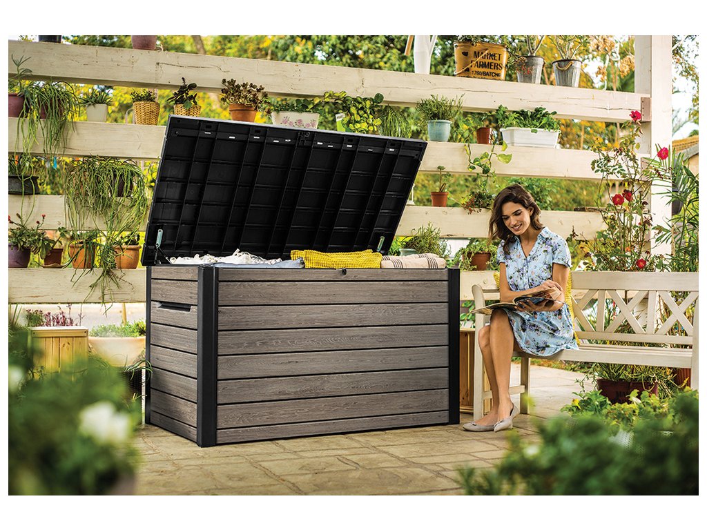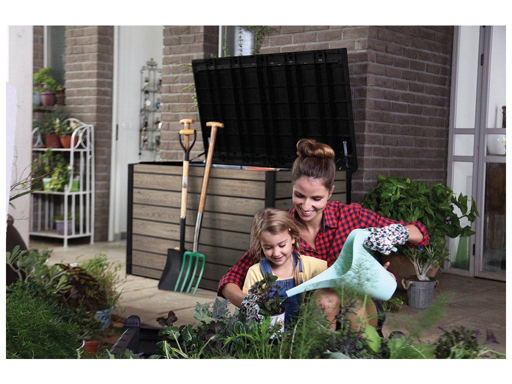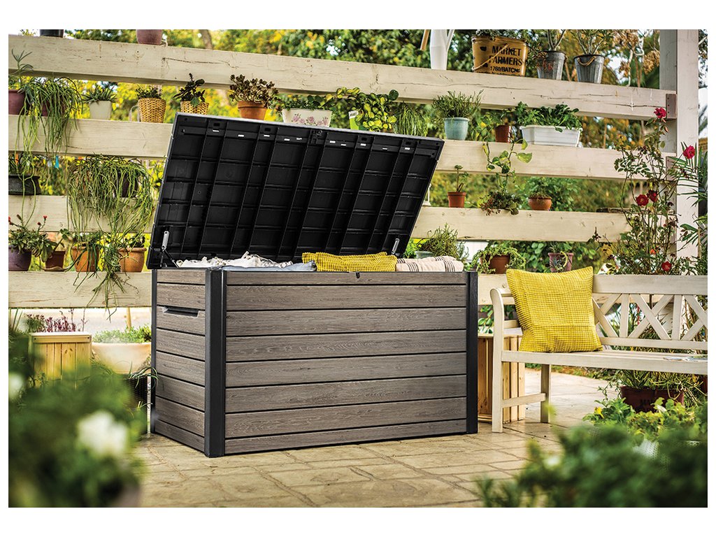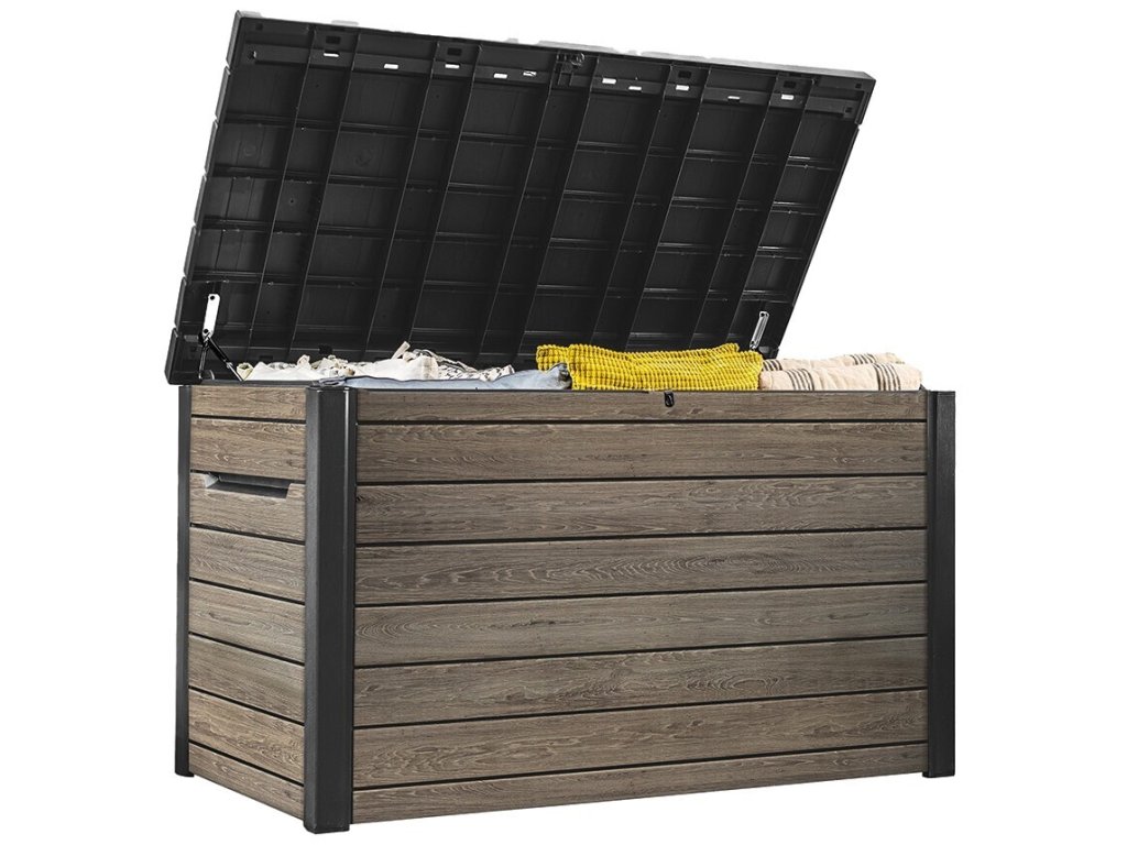 - Prostornost a organizace: Objem 870 L poskytuje dostatek místa pro uložení různých zahradních potřeb, jako jsou podušky, květináče a další doplňky. Jednoduchému otevírání pomáhají hydraulické písty, díky nimž víko zároveň drží v otevřené poloze.