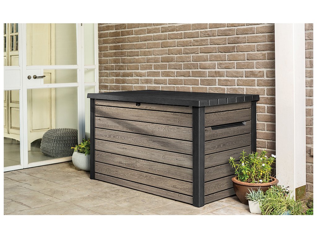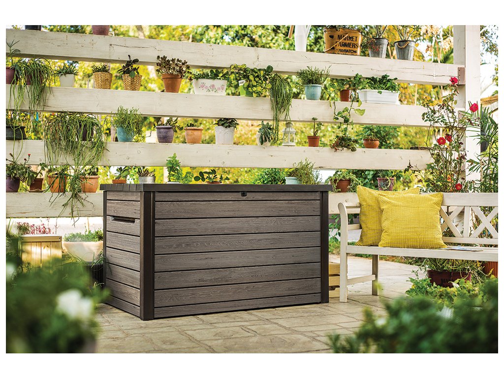 - Jednotný design: Úložný box v elegantním odstínu vlašského ořechu (walnut) je součástí řady SIGNATURE, což Vám umožní sjednotit exteriér s dalšími prvky, jako je zahradní domek nebo vysoká úložná skříň či skříň na popelnice.
