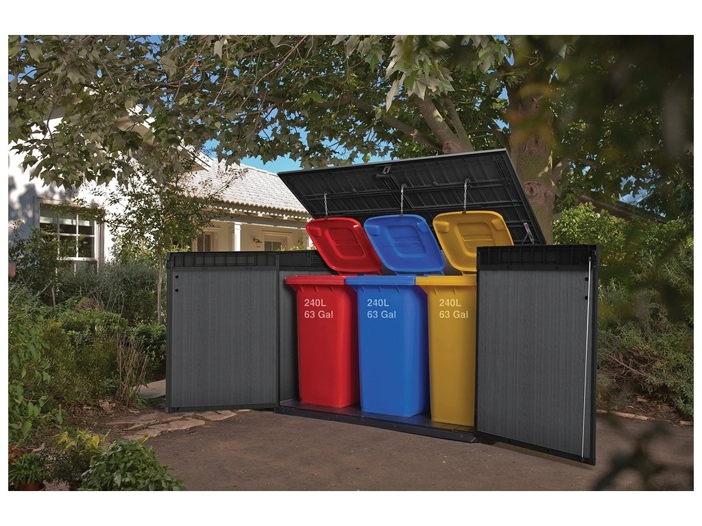 Bez problému můžete také uložit uvnitř: barbecue gril, podušky, konve, květináče, hračky a mnohé další předměty. Ideální volba pro uskladnění popelnic. Skříň pojme tři popelnice o objemu 240 L, součástí balení jsou i řetízky, díky nimž se víka popelnic otevírají spolu s víkem skříně. Zabudovaná je i ventilace pro prevenci zápachu.