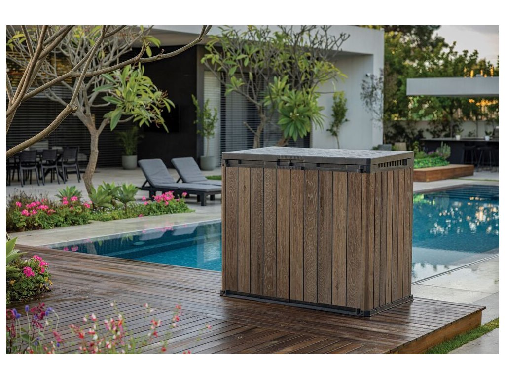 Designová, plastová skříň z řady DECO HORIZONTAL STORE IT OUT v provedení WALNUT disponuje úložným prostorem o objemu 1 150 L.