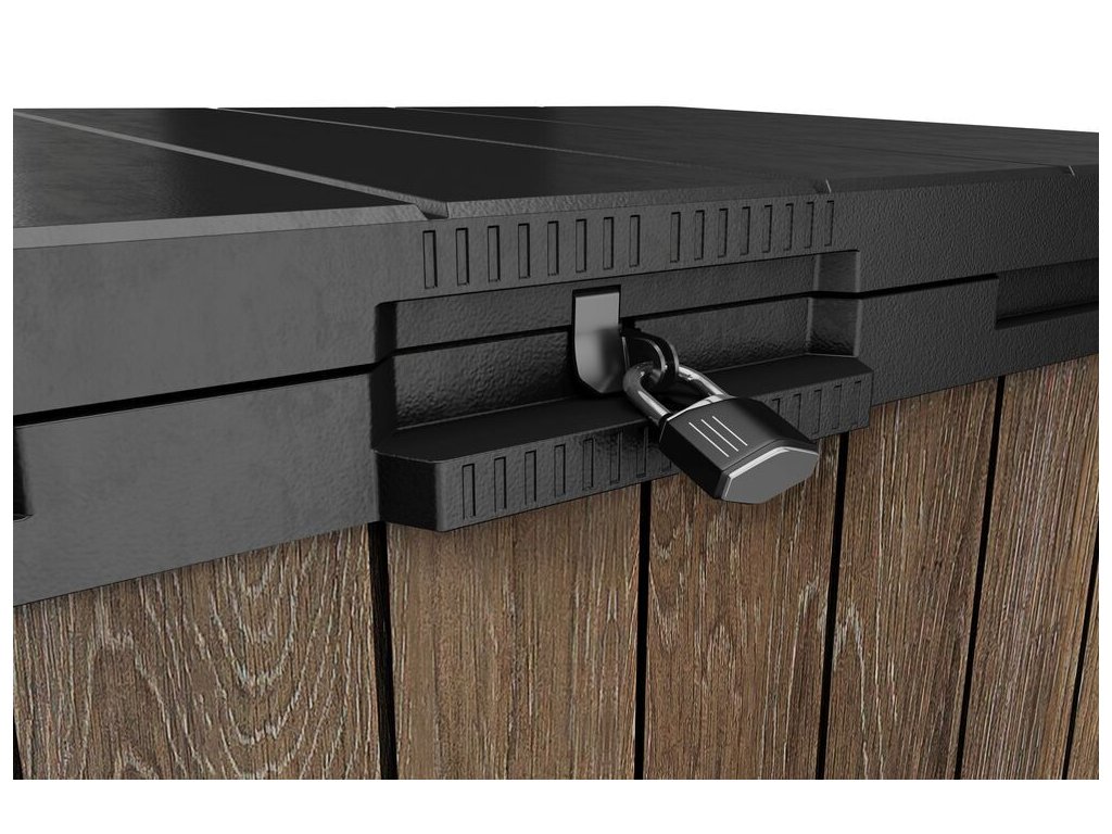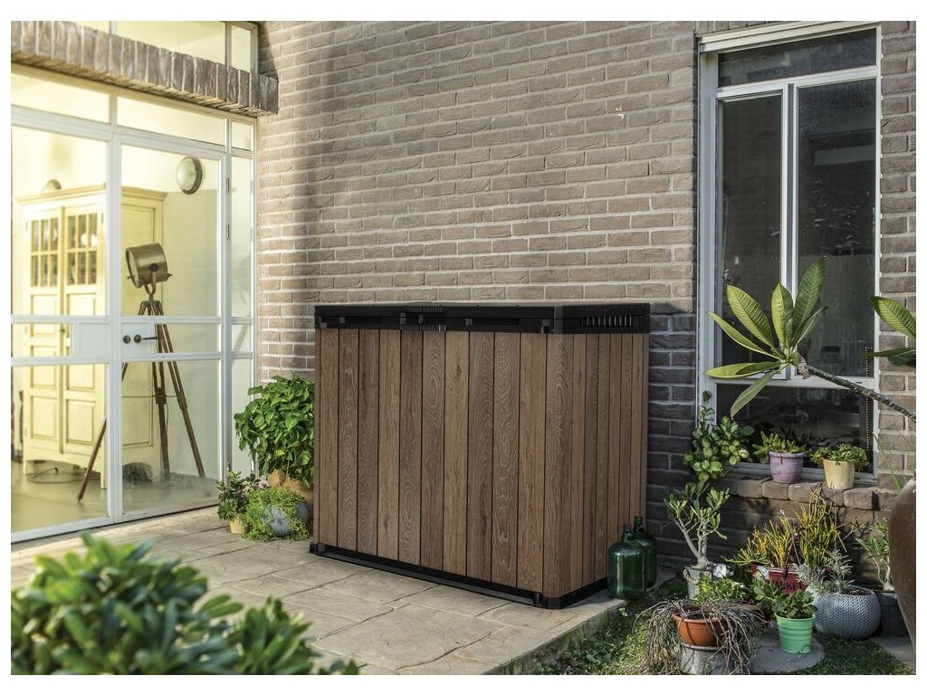 Skříňka umožňuje pohodlně uložit vše, co chcete mít po ruce na Vaší zahradě. Ideální pro uschování zahradního nářadí, zahradních doplňků nebo sportovního vybavení. Je možné do ní také uschovat popelnice.