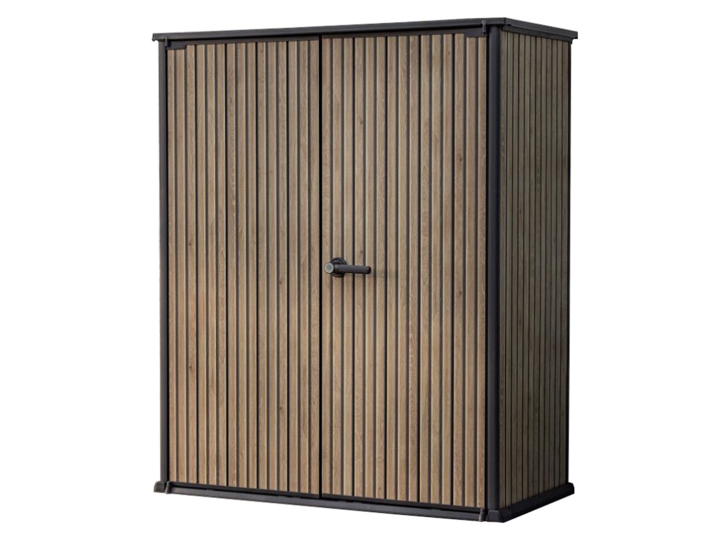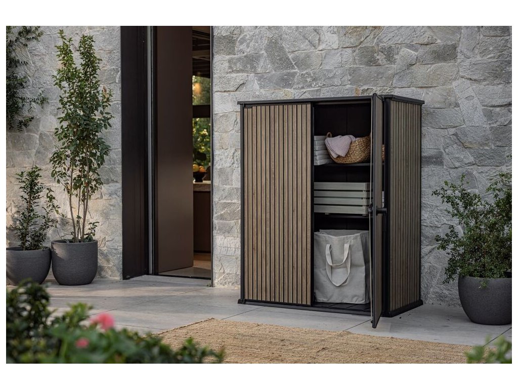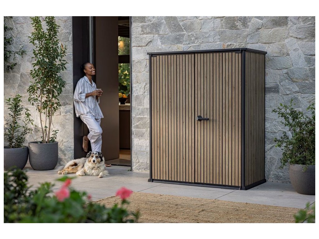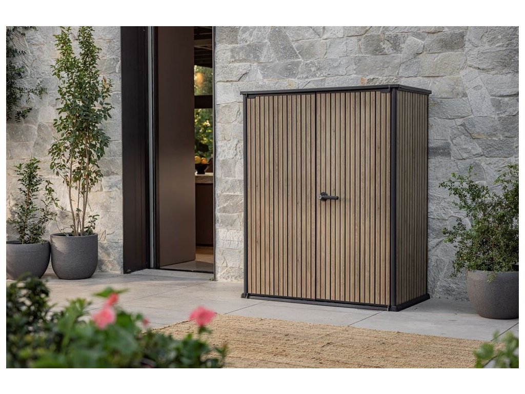 - Jednotný design: Skříň v elegantním odstínu hnědé barvy v imitaci uzkých lamel dřeva je součástí řady SIGNATURE, což vám umožní sjednotit exteriér s dalšími prvky, jako je zahradní domek nebo skříň na popelnice.