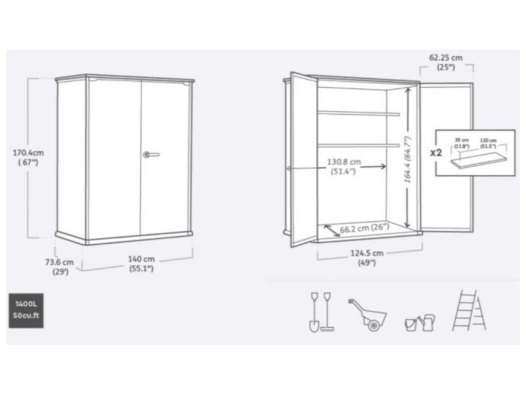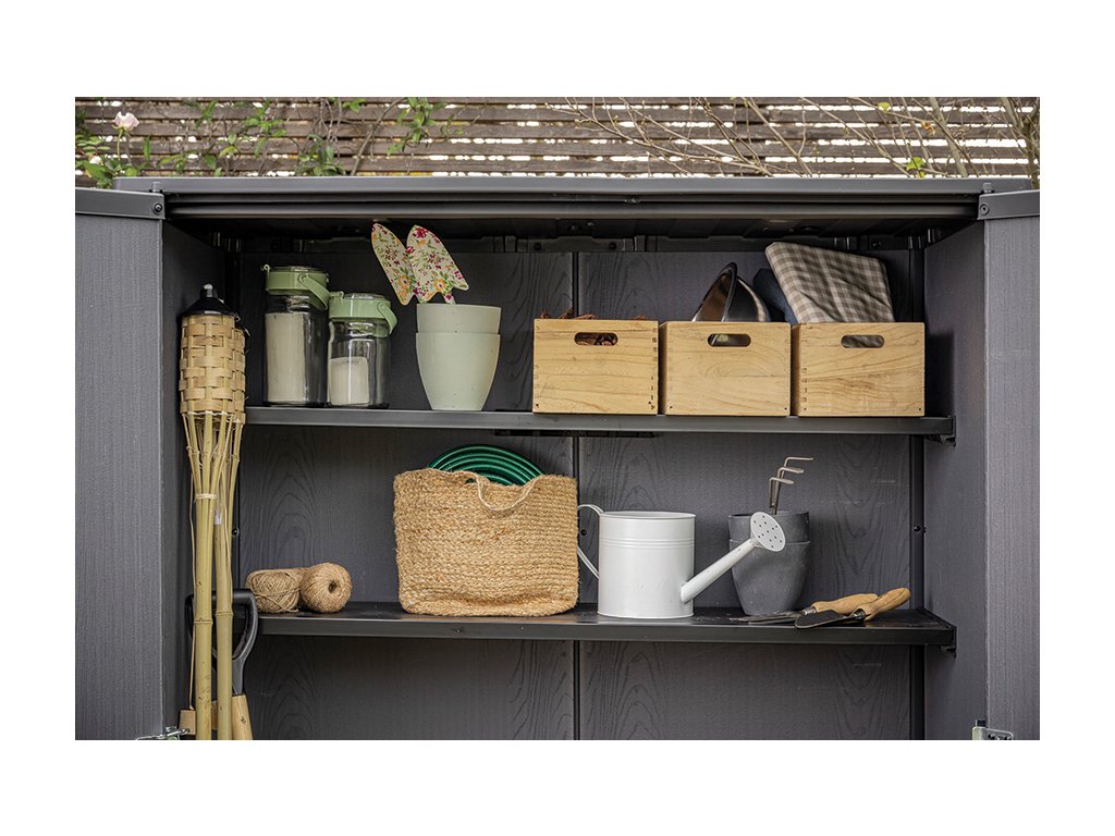- Prostornost a organizace: Objem 1 400 L poskytuje dostatek místa pro uložení různých zahradních potřeb, jako je nářadí, květináče a další doplňky. Součástí skříně jsou dvě police, každá s nosností 25 kg. Díky policím můžete prostor ještě lépe uspořádat dle potřeby.