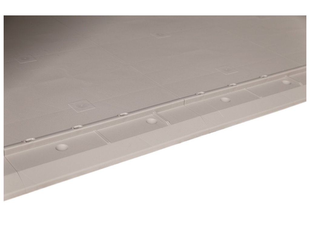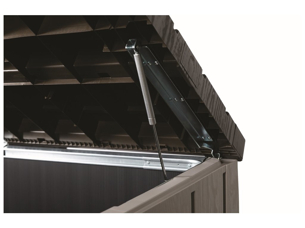 S nesmírně praktickými dvoukřídlými dveřmi a otevíracím víkem, které lze ovládat snadno a hladce díky pístům (vzduchovým vzpěrám), se dostanete ke svému vybavení během okamžiku. Přístup do skříně je navíc ještě usnadněn šikmým prahem, který umožňuje snadné uskladnění například popelnic nebo jiných předmětů.