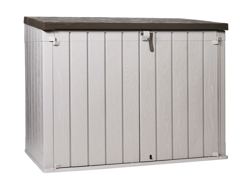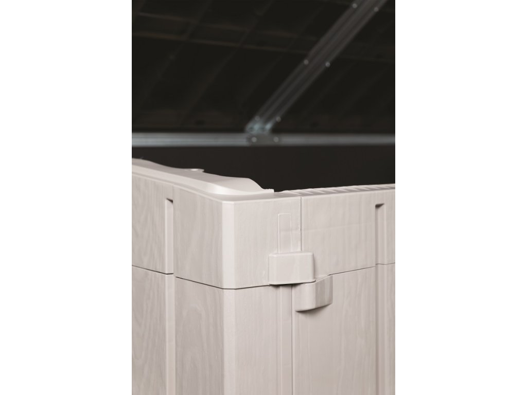 Eleganci dodává její imitace dřevěného povrchu, která je doplněna barevným provedením béžových stěn a hnědého víka, čímž se skříň stává nejen praktickým prvkem, ale také stylovým doplňkem Vaší zahrady.