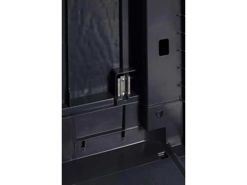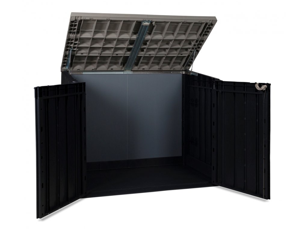 S nesmírně praktickými dvoukřídlými dveřmi a otevíracím víkem, které lze ovládat snadno a hladce díky pístům (vzduchovým vzpěrám), se dostanete ke svému vybavení během okamžiku. Přístup do skříně je navíc ještě usnadněn šikmým prahem, který umožňuje snadné uskladnění například popelnic nebo jiných předmětů.