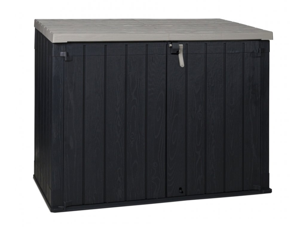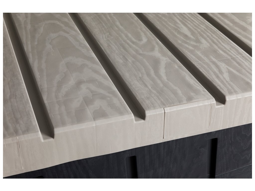 Eleganci dodává její imitace dřevěného povrchu, která je doplněna barevným provedením grafitových stěn a světle šedého víka, čímž se skříň stává nejen praktickým prvkem, ale také stylovým doplňkem Vaší zahrady.
