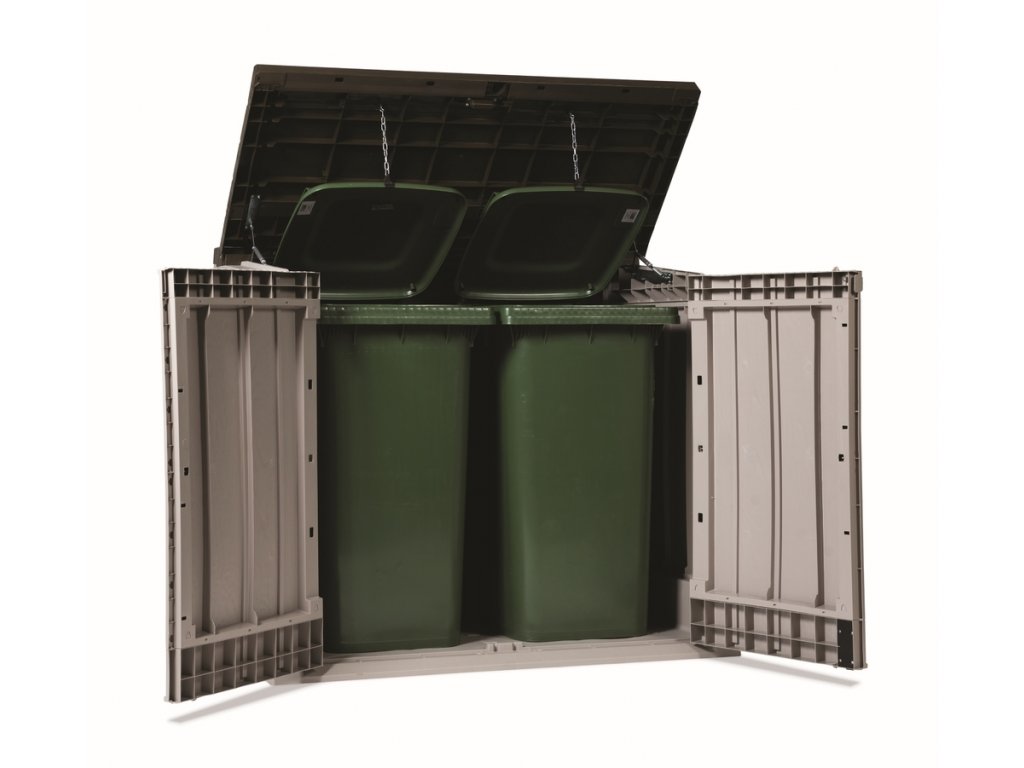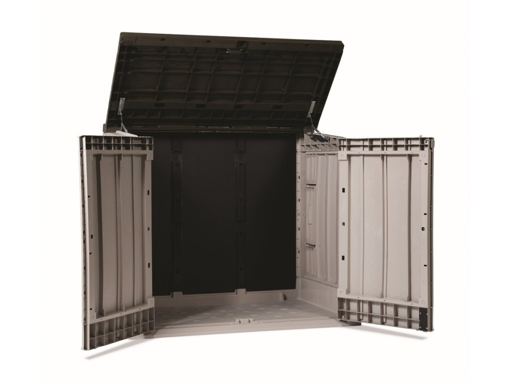 S nesmírně praktickými dvoukřídlými dveřmi a otevíracím víkem, které lze ovládat snadno a hladce díky pístům (vzduchovým vzpěrám), se dostanete ke svému vybavení během okamžiku. Přístup do skříně je navíc ještě usnadněn šikmým prahem, který umožňuje snadné uskladnění například popelnic nebo jiných předmětů.