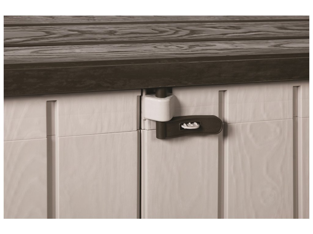 Eleganci dodává její imitace dřevěného povrchu, která je doplněna barevným provedením béžových stěn a hnědého víka, čímž se skříň stává nejen praktickým prvkem, ale také stylovým doplňkem Vaší zahrady.