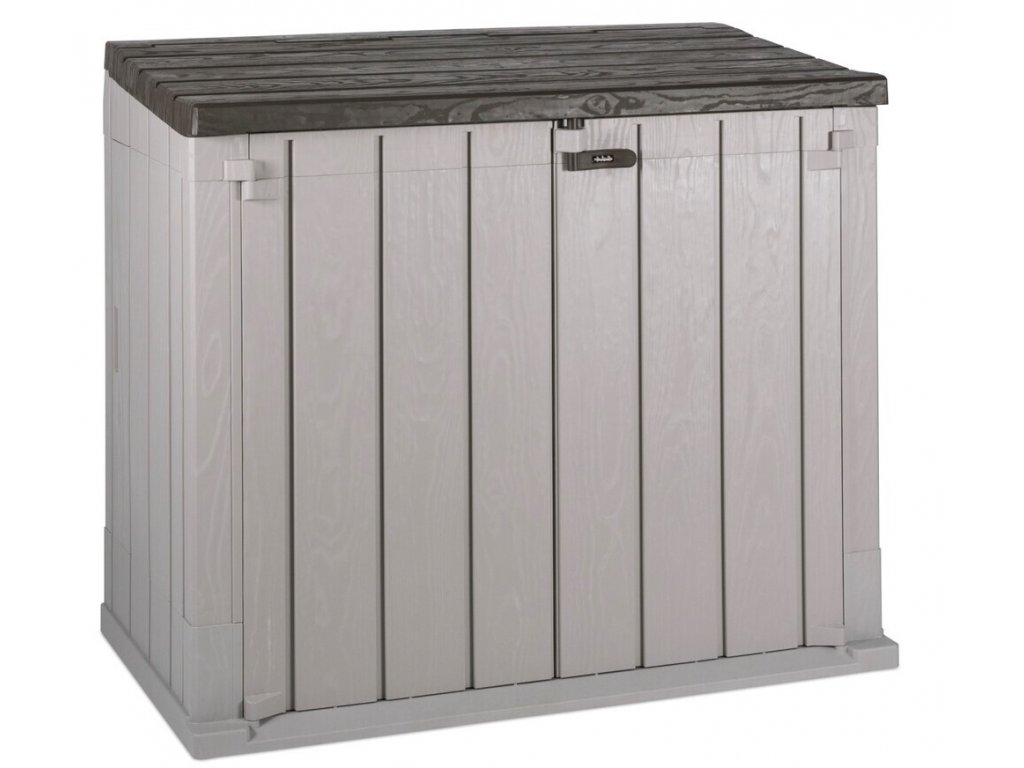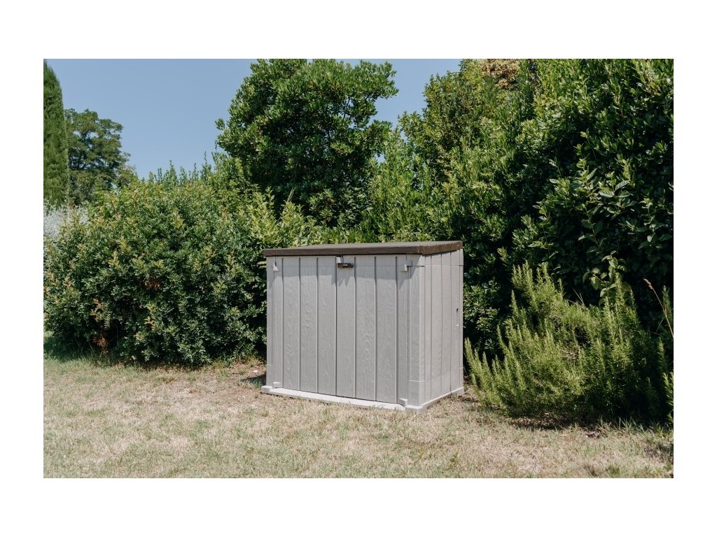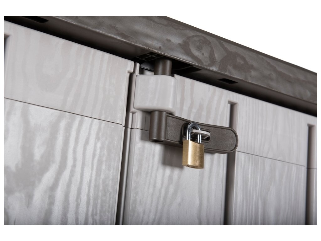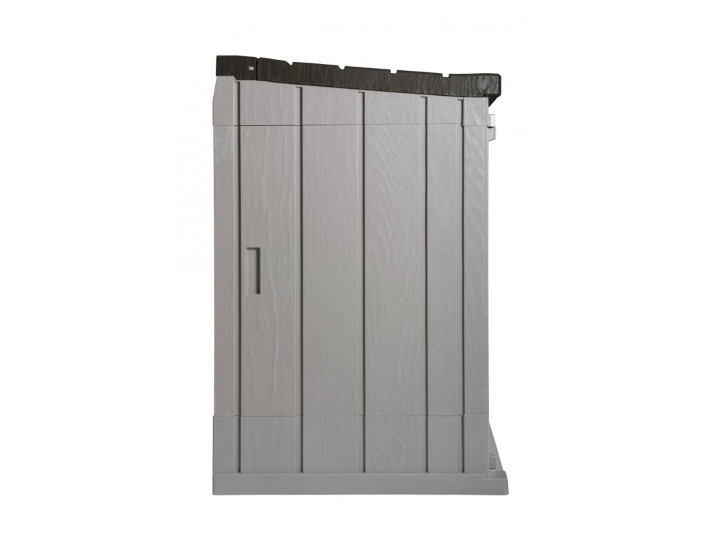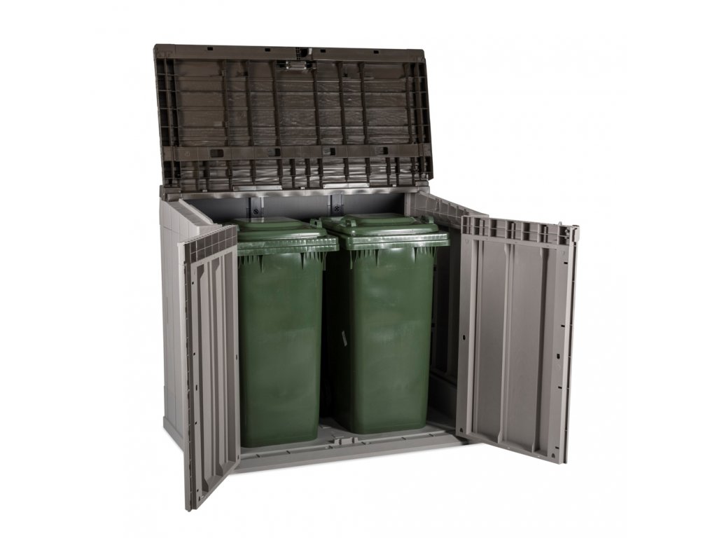 Výhody tohoto skvostu jsou zřejmé: dvoukřídlé dveře a otevírací víko nabízí mnoho možností využití. Bez námahy a s elegancí zvládnete přístup i manipulaci s obsahem. Šikmý práh dále usnadňuje přístup dovnitř, umožňuje snadné umístění popelnic či jiných objemných předmětů. Zajímavé barevné provedení kombinuje béžové stěny a hnědé víko.