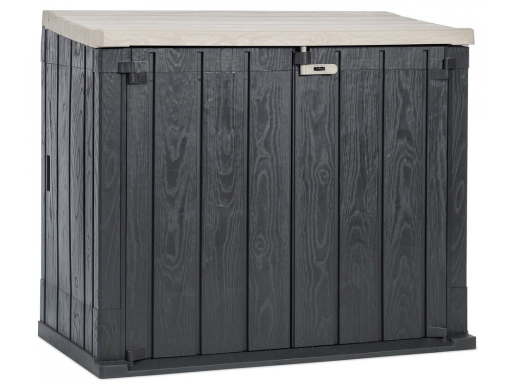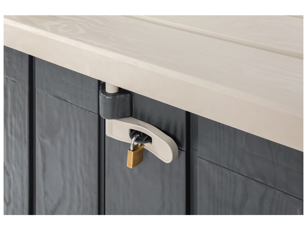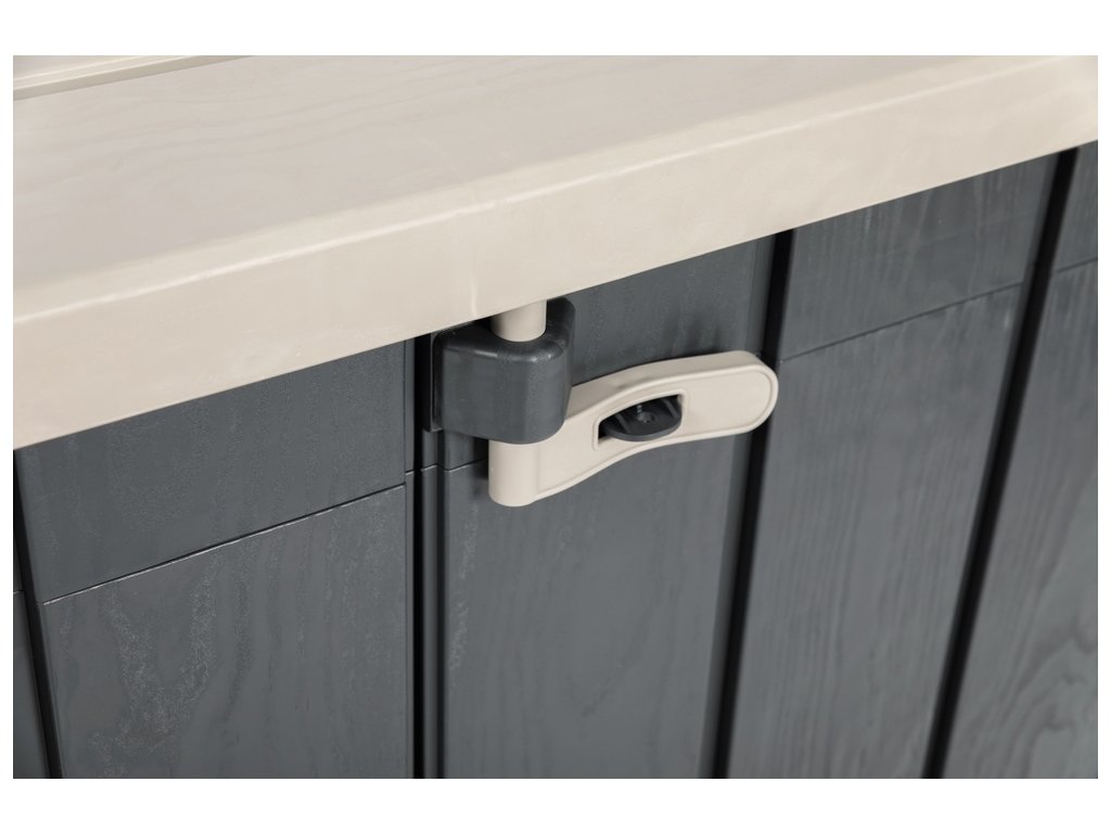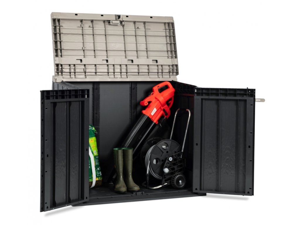 Výhody tohoto skvostu jsou zřejmé: dvoukřídlé dveře a otevírací víko nabízí mnoho možností využití. Bez námahy a s elegancí zvládnete přístup i manipulaci s obsahem. Šikmý práh dále usnadňuje přístup dovnitř, umožňuje snadné umístění popelnic či jiných objemných předmětů. Zajímavé barevné provedení kombinuje grafitové stěny a světle šedé víko.