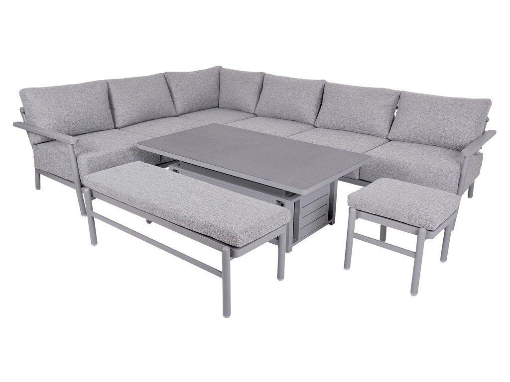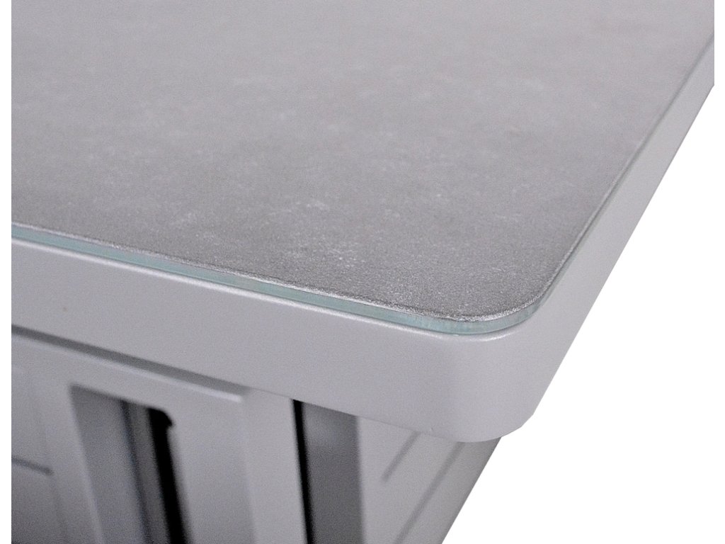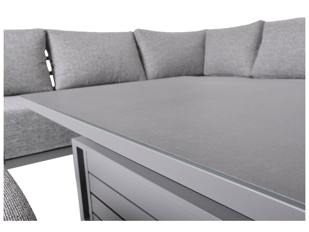 materiál: | hliníková konstrukce + 20 cm vysoké podušky (polyester), deska stolu - keramické sklo |