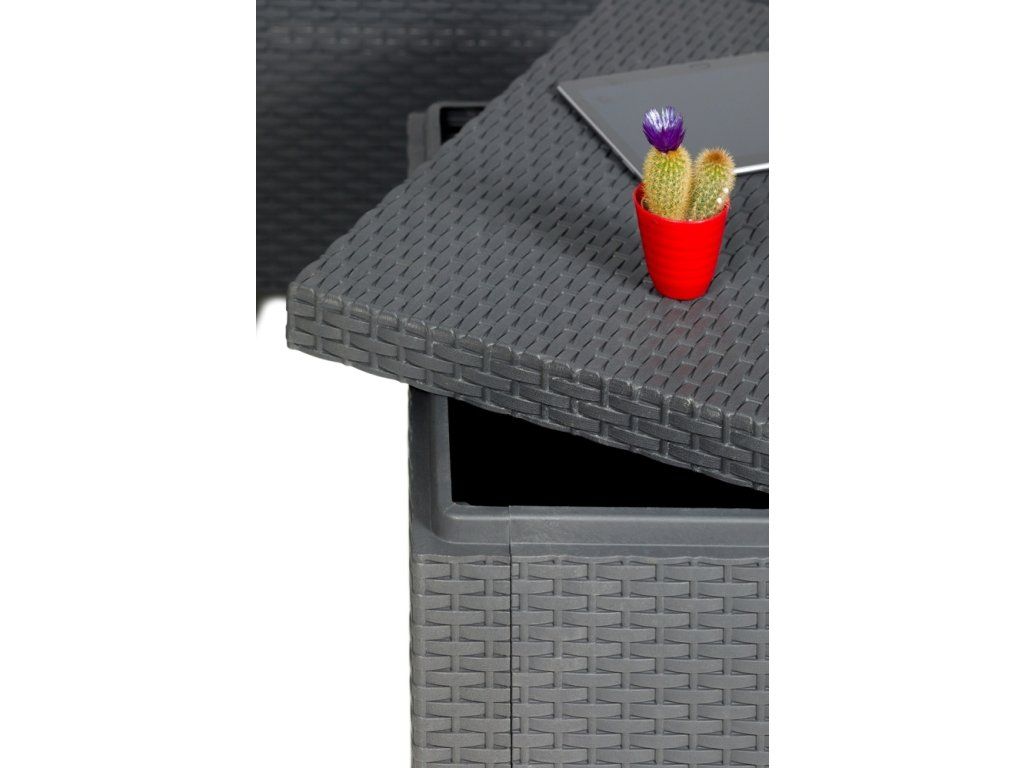 Praktický stolek, sloužící rovněž jako úložný box, vám umožňuje udržet Vaše venkovní prostory uklizené a pohodlně uschovat předměty při nečekaném přívalu povětrnostních vlivů.