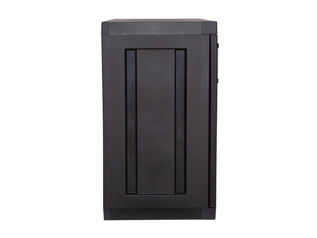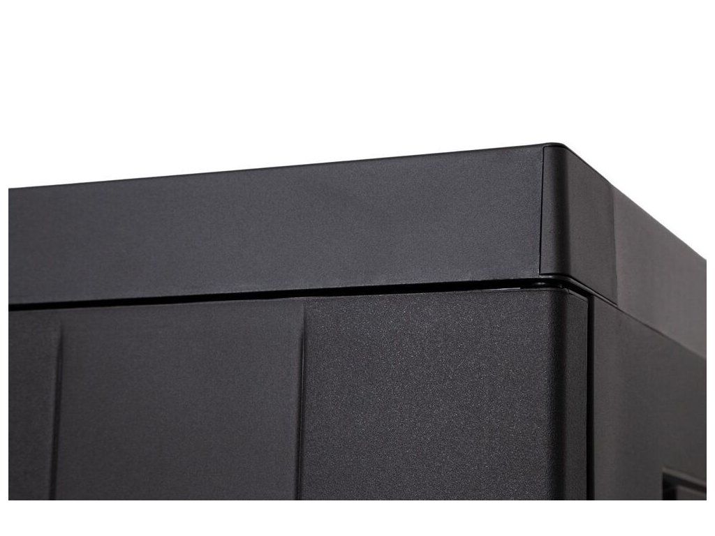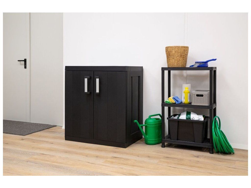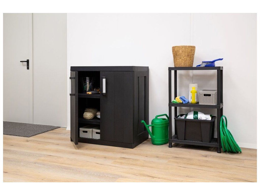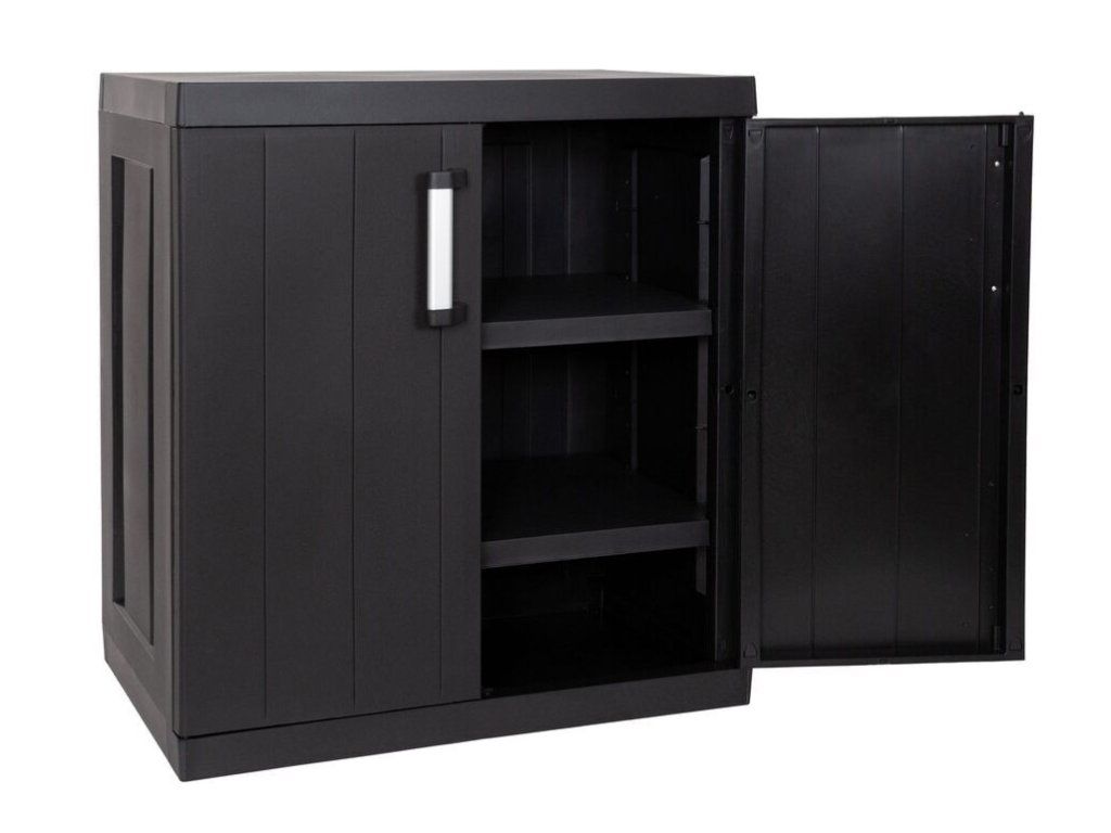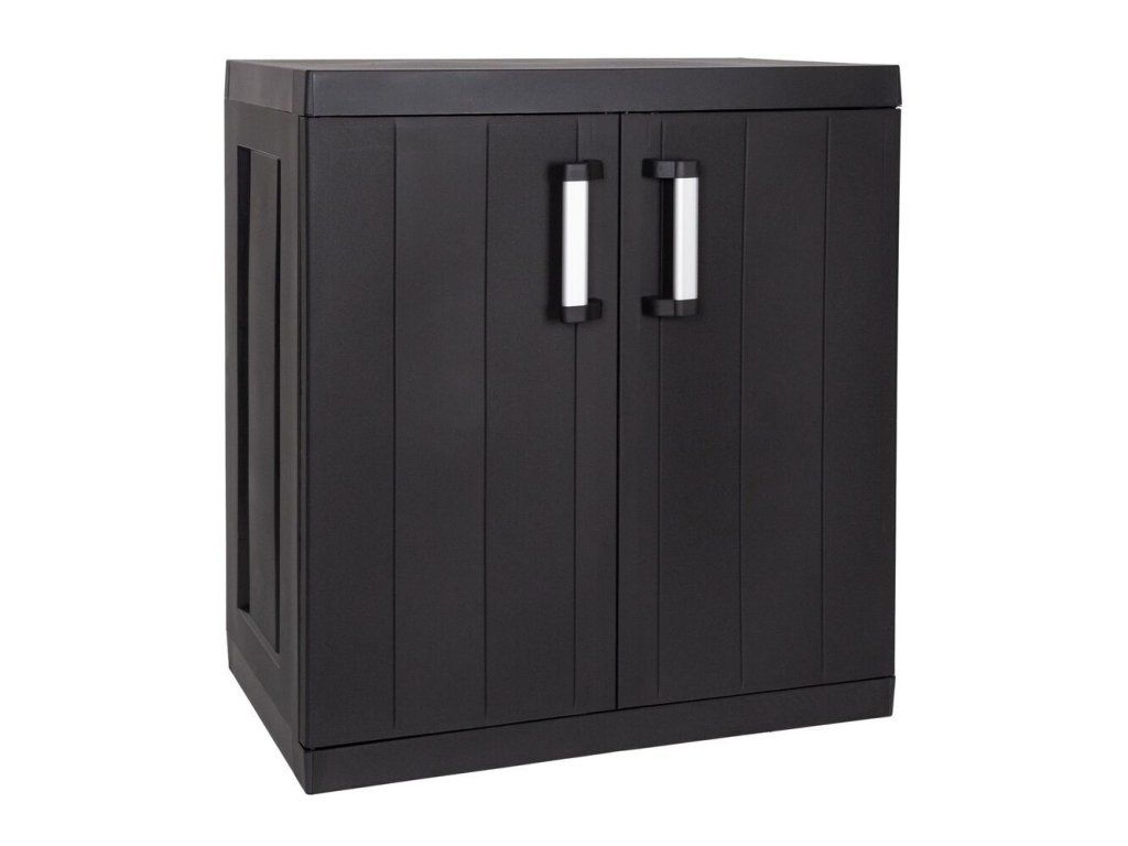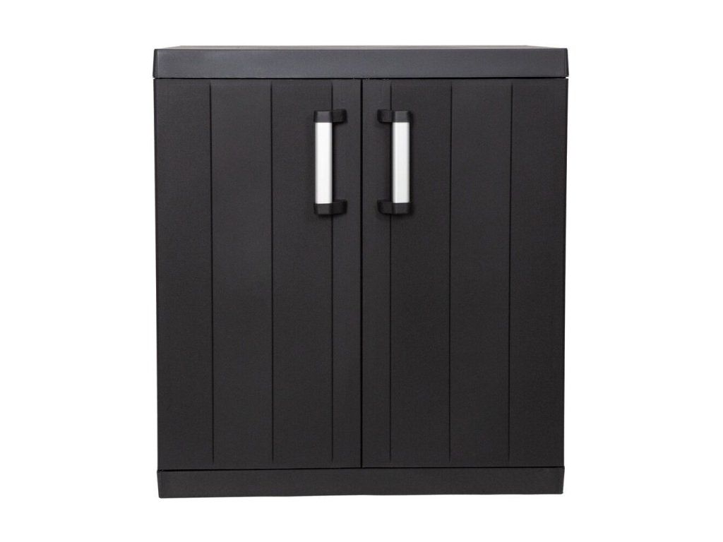 Prostorná praktická plastová dvoukřídlá skříňka GARAGE MEGA LOW v černé barvě.