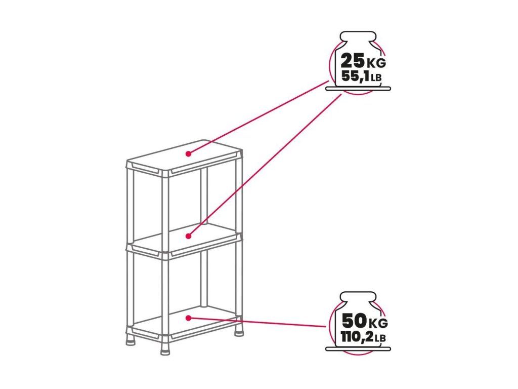 Regál disponuje třemi policemi. Spodní police má nosnost až 50 kg, zatímco další dvě police jsou schopny každá unést až 25 kg, což umožňuje bezpečné a efektivní uskladnění různorodých předmětů a vybavení.