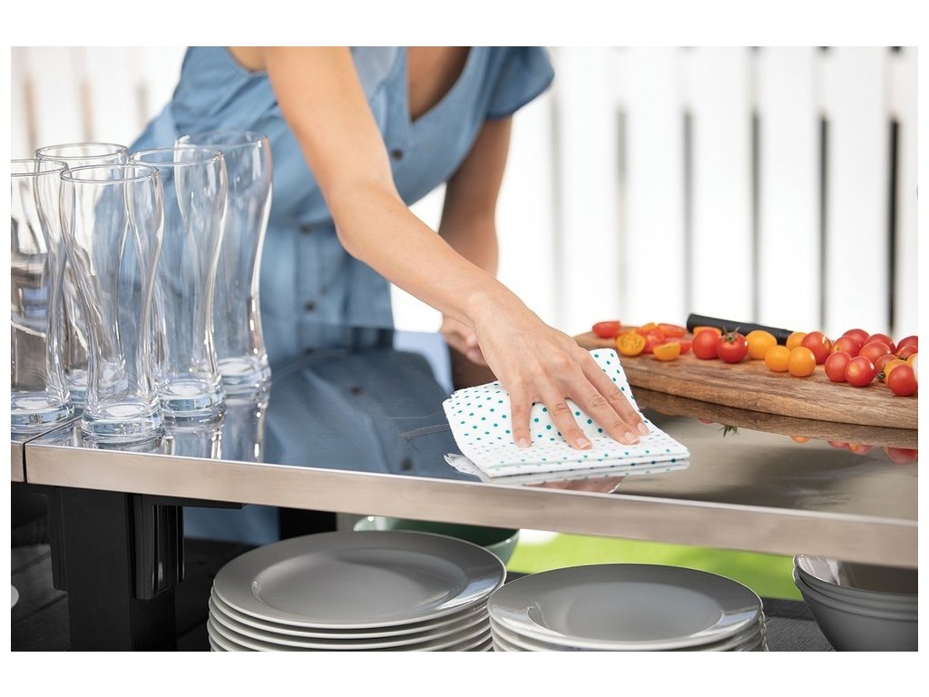 Dvě prostorné skříňe s dvojitými dveřmi vybavené dlouhou funkční nerezovou deskou a praktickou rukojetí s háčkem na ručníky, bude dobře fungovat při důležitých rodinných setkáních na terase nebo na zahradě.