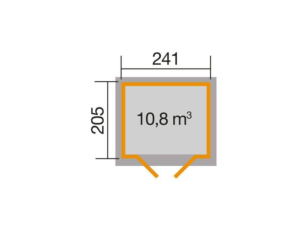 Základna domku (bez přesahu střechy) je 241 x 205 cm, domek má sedlovou střechu z masivního dřeva o tloušťce 16 mm a síle stěny o tloušťce 28 mm. Kvalitní dvoukřídlé dveře se sadou klik a cylindrickým zámkem zajišťují bezpečnost a vysokou funkčnost.