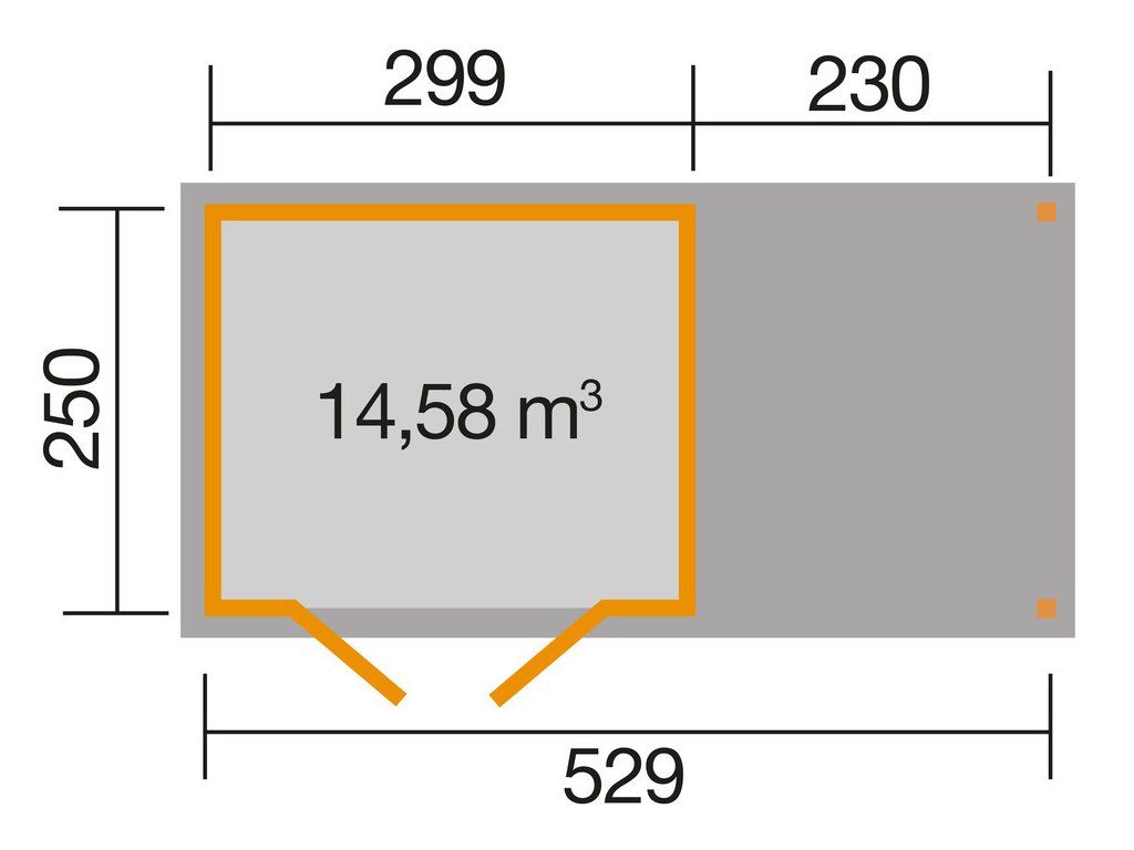 Základna domku (bez přesahu střechy) je 299 x 250 cm s nástavbou 230 x 250 cm. Síle stěny 19 mm, podlaha z masivního dřeva o tloušťce 15,5 mm a střecha z masivního dřeva o tloušťce 16 mm zajišťují optimální stabilitu.