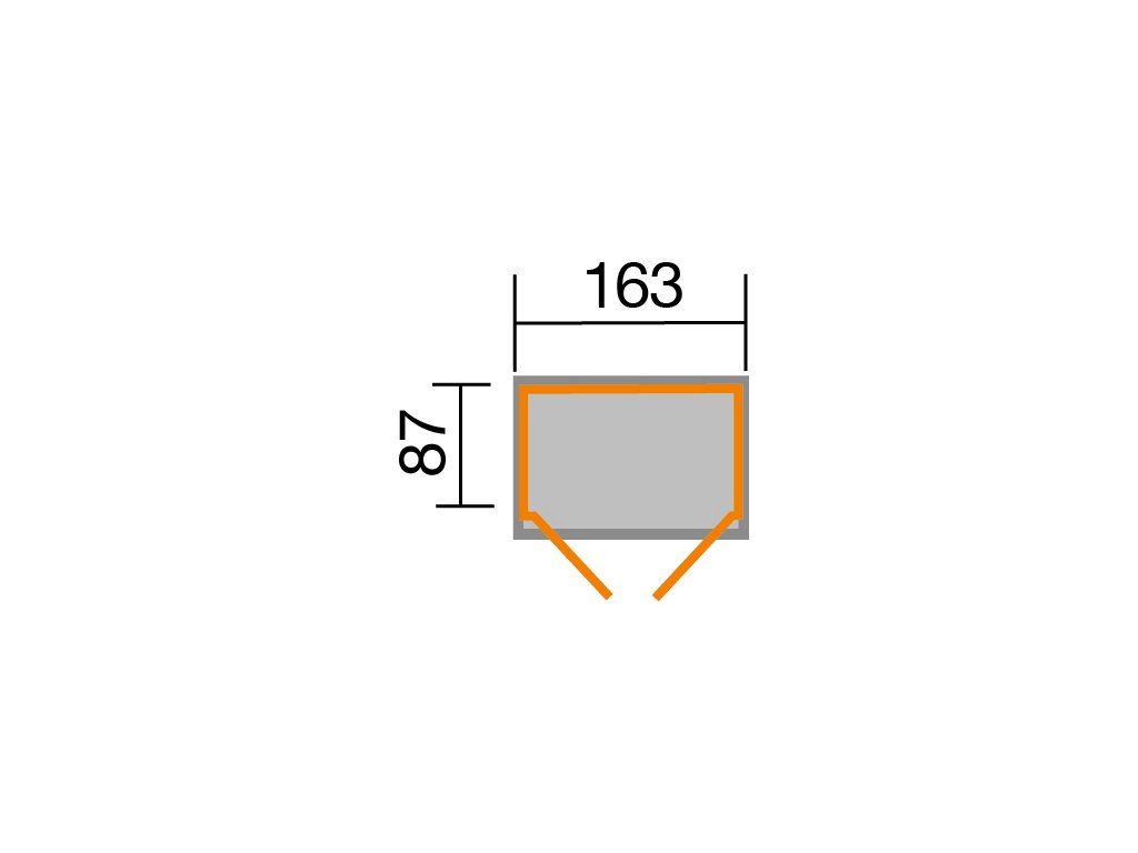 Základna domku (bez přesahu střechy) je 163 x 87 cm, jedná se o domek s menší tloušťkou stěny 14 mm, 19 mm podlahou a 14 mm šikmou střechou.