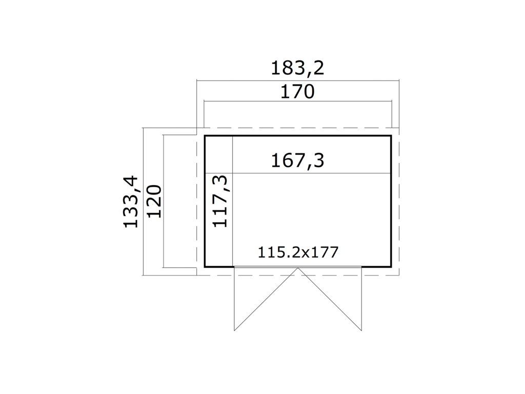 Základna domku (bez přesahu střechy) je 170 x 120 cm, jedná se o domek s menší tloušťkou stěny 13 mm a 15 mm šikmou střechou.