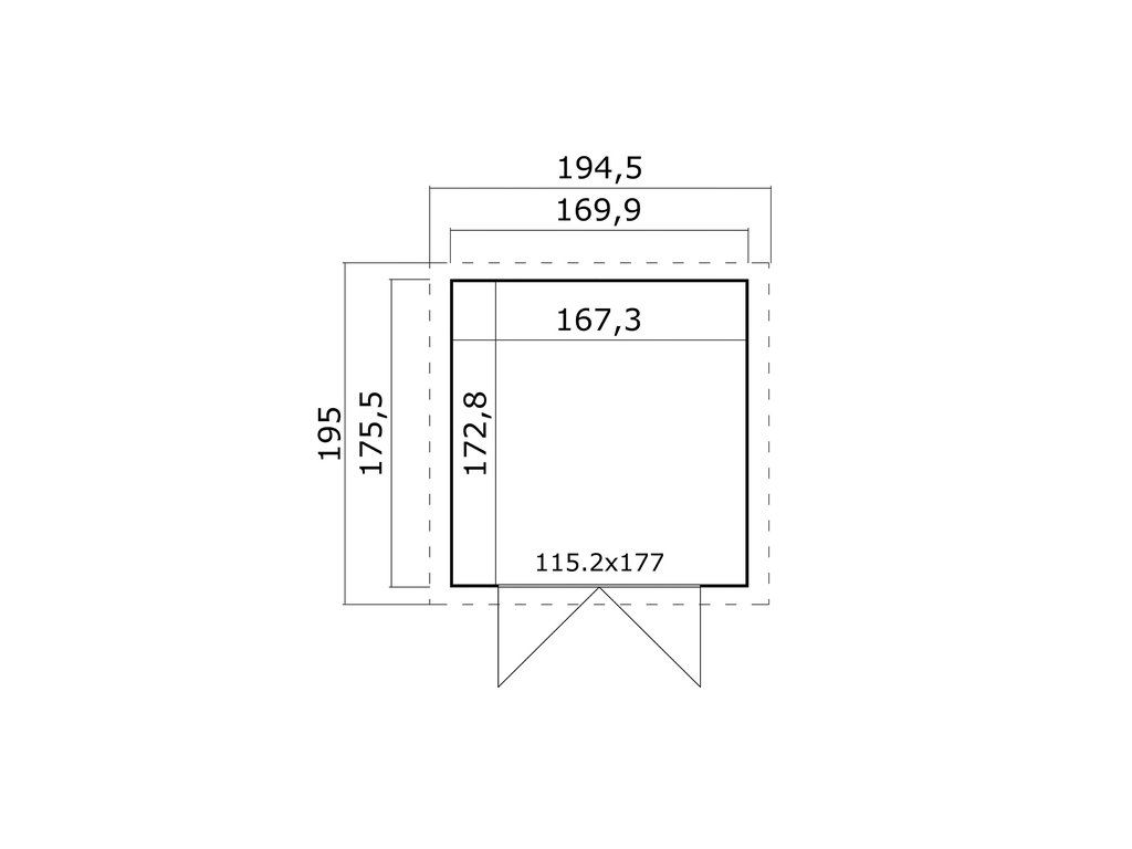 Základna domku (bez přesahu střechy) je 170 x 175,5 cm, jedná se o domek s menší tloušťkou stěny 13 mm a 15 mm šikmou střechou.