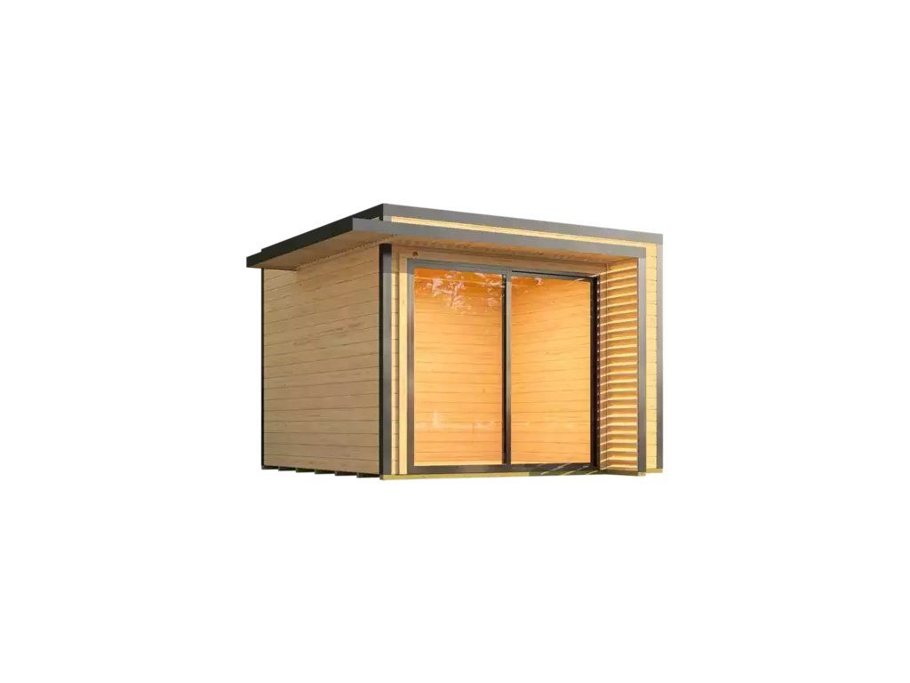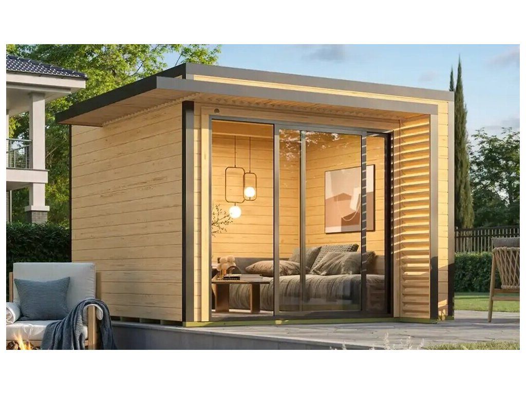 Domek z řady WEKA Pure Garden, stylový zahradní minimalistický domek, který ve vaší zahradě vytváří harmonické spojené mezi přírodou a moderním designem. Je doplněn o designové dvoukřídlé dveře s velkou prosklenou tabulí v levém křídle. Boční a střešní lamely dodávají domku stylový vzhled. Je doplněn o skleněné posuvné dveře s hliníkovými rámy.