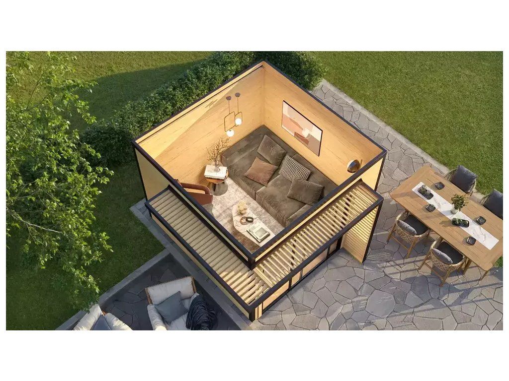 Základna domku je 300 x 300 cm, síle stěny 28 mm, podlaha z masivního dřeva o tloušťce 16 mm. Konstrukci lze jednoduše postavit díky modernímu šroubovacímu systému.