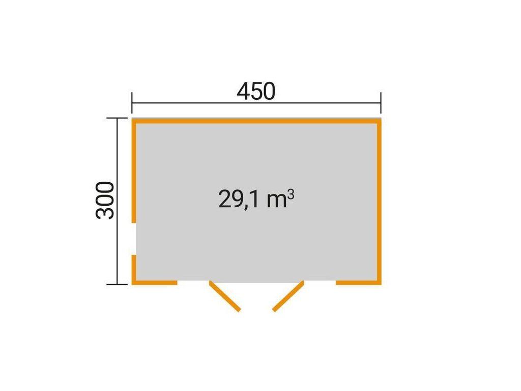 Základna domku je 450 x 300 cm, síle stěny 28 mm, podlaha z masivního dřeva o tloušťce 15 mm. Konstrukci lze jednoduše postavit díky šroubovacímu systému.